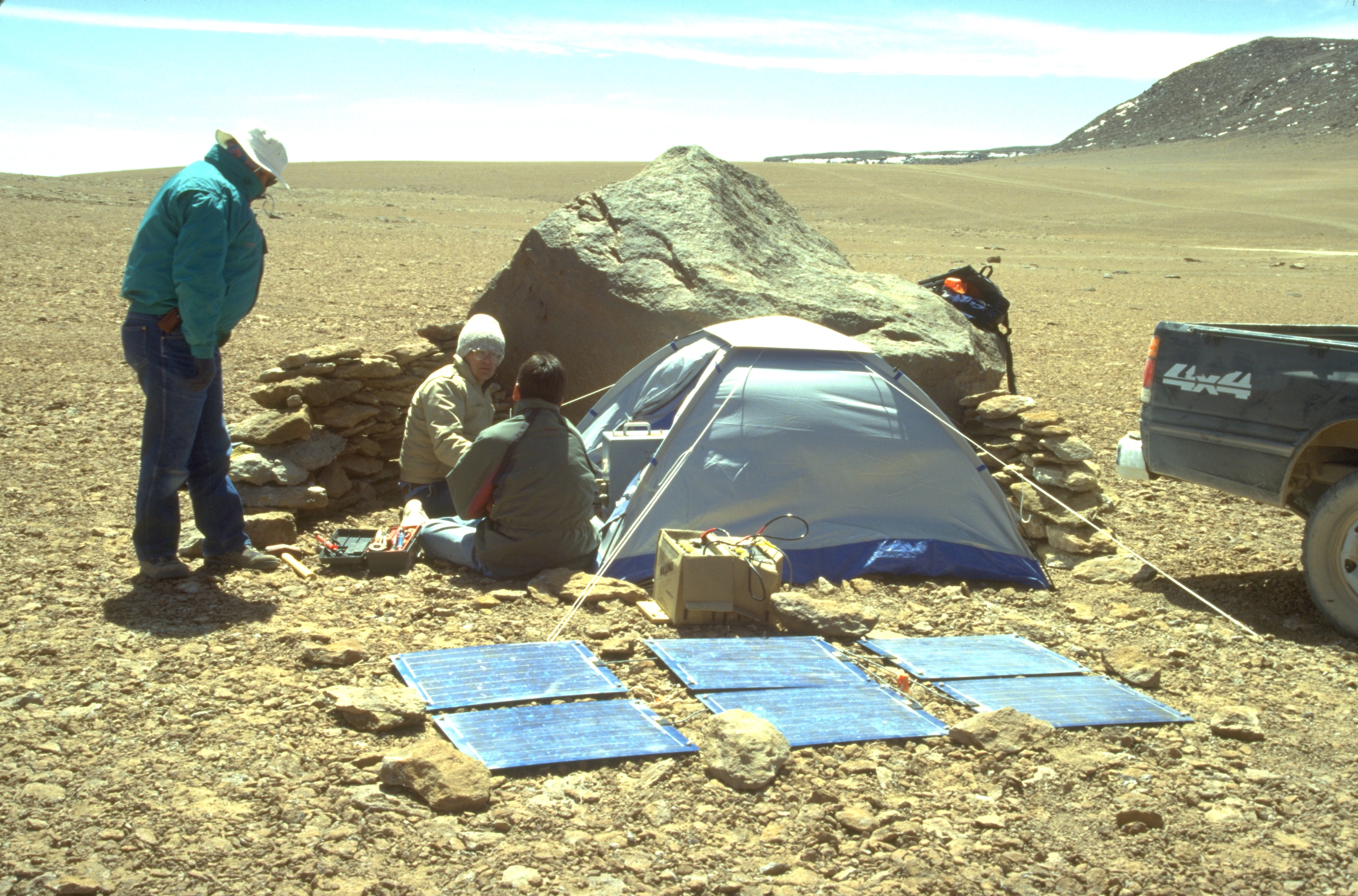 In late October and early November 1994, Peter Napier (standing), Angel Otarola (back to camera), Frazer Owen (wool hat), and Simon Radford (taking the photo) visited a possible site for the Millimeter Array on the Chilean Chajnantor plateau, the eventual site for ALMA. This photo, looking to the west and into the prevailing wind, shows equipment sheltered behind a large rock, with small wind break walls built to each side. Solar panels on the ground and batteries in the cardboard box power a 225 GHz tipping radiometer, the gray box with a handle sitting in the door of the tent. The team, here troubleshooting some difficulty with the tipping radiometer, made the first measurements of millimeter wavelength (225 GHz) atmospheric transparency on the Chajnantor plateau. These measurements gave the first indication the plateau enjoys excellent observing conditions for submm astronomy, much better than any sites previously considered for the MMA. More extensive measurements, which began in April 1995, confirmed the initial indications. Thanks to Simon Radford for the photo and for caption information. (Radford_nov1994_IMG0035.jpg)