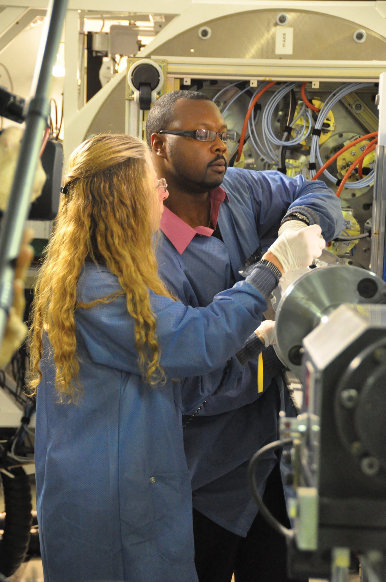 Wendy Harper and Erik Gaines ready the ALMA Front End Integration Center's testing lab. Behind them is a model of the back of an ALMA antenna dish. The Front End is the cryogenically-cooled cabinet filled with the ten receivers used by ALMA astronomers. This testing facility reproduces the movements of an antenna and provides simulated observations for the receivers. Put through its paces, Front Ends for ALMA are adjusted to perfection before being shipped to Chile for integration into assembled ALMA antennas. This facility at NRAO in Charlottesville, Virginia tested 22 Front Ends for ALMA. Our partners in Japan and Europe delivered the other 44.