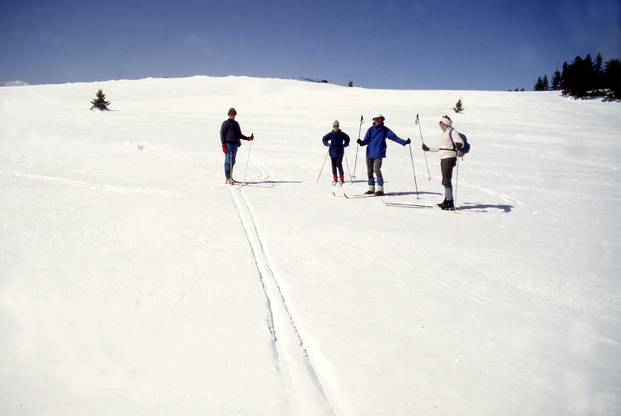 The inauguration of ALMA was preceded by many, many years of work, including exploration and evaluation of many sites and the evolution and eventual merging of array projects from different countries. Some of the earliest sites considered for the MMA were in New Mexico near the VLA. This photo from early 1992, was taken at the proposed center of the MMA site in the Magdalena Mountains, now the site of the Magdalena Ridge Observatory Interferometer, looking north toward the South Baldy summit. Visiting observer Don Backer with NRAO staff members Joan Wrobel, Dave Wunker, and Phil Dooley, make one of the frequent visits to that site to check snow levels and tipper data. Craig Walker says Backer's skis and poles were borrowed: "Don's participation in one of our South Baldy trips is something we remember well. He was here on other business and had to borrow gear. Hence the blue jeans (rather inappropriate for a ski trip) and the satchel rather than a pack." Perhaps his upside pole is informally measuring snow depth? A crane at one of the NMIMT research sites is just visible over the crest. Thanks to Peter Napier for the original slide and to Peter, Gareth Hunt, Craig Walker, Joan Wrobel, and Frazer Owen for identifying the people and for information about the visit.