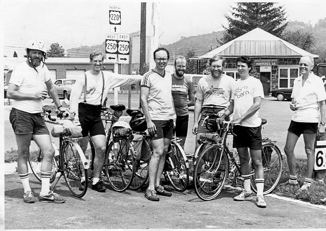 For many years, Hein Hvatum, long-time NRAO Associate Director and avid bicyclist, organized a group each summer to bicycle the 117 mountainous miles from Charlottesville to Green Bank to attend the annual Green Bank picnic. The group rode to Green Bank on Friday, went to the picnic on Saturday, and many of them then cycled from Green Bank back to Charlottesville on Sunday. In this 1984 photo, riders pause for a break in Monterey VA. Left to right: Bill Cotton, Ed Sieveka, Kurt Riegel, Tom Brookes, Craig Walker, Buddy Martin, Hein Hvatum. (biking_to_gb.jpg)
