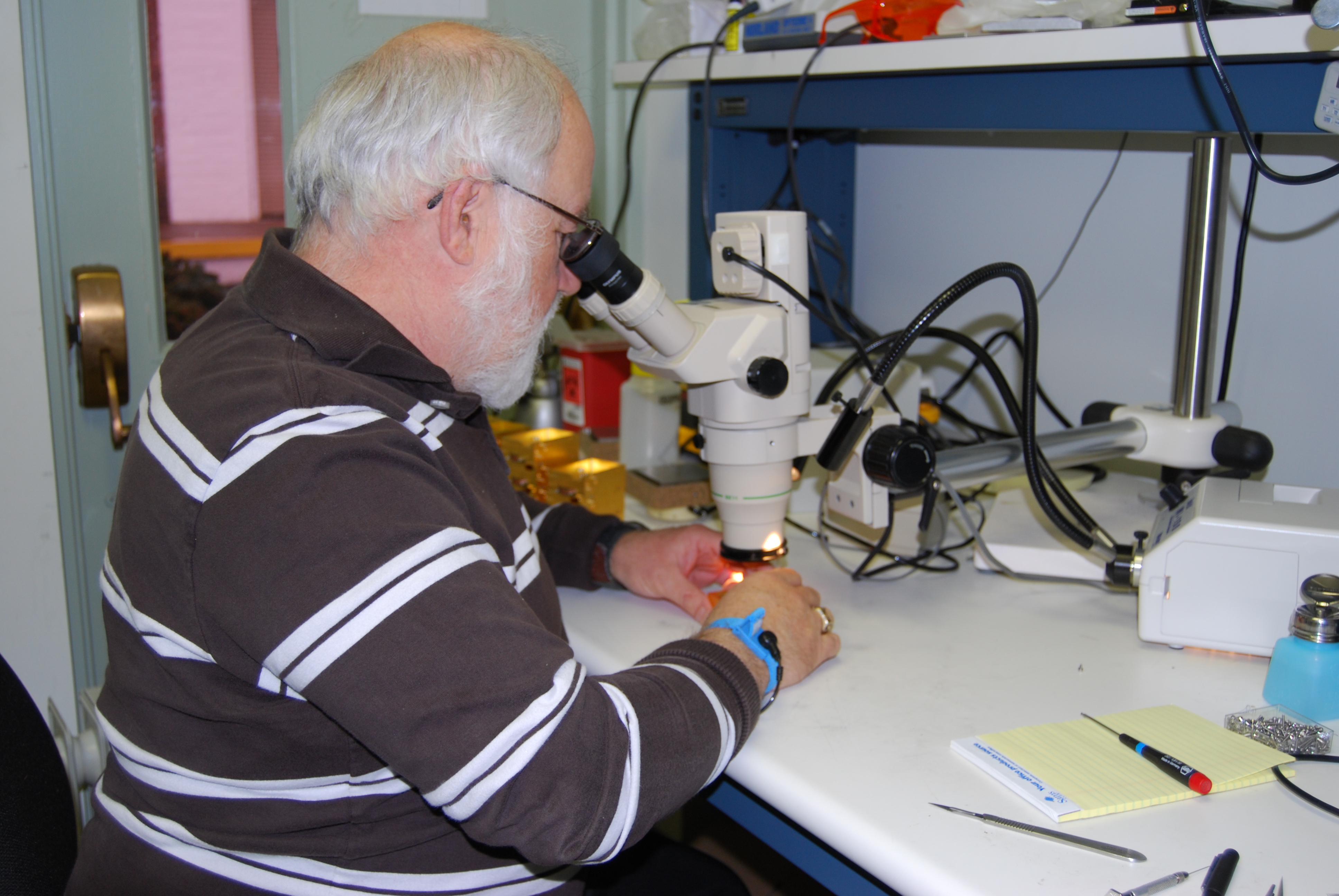 Skip Thacker in the NTC LO micro-assembly lab where power amplifiers for the ALMA LO system were built and/or inspected. In this photo he is inspecting an amplifier, one of a set received from a contract assembler (note the stack of amplifiers to Skip's left). (DSC_0083.JPG)
