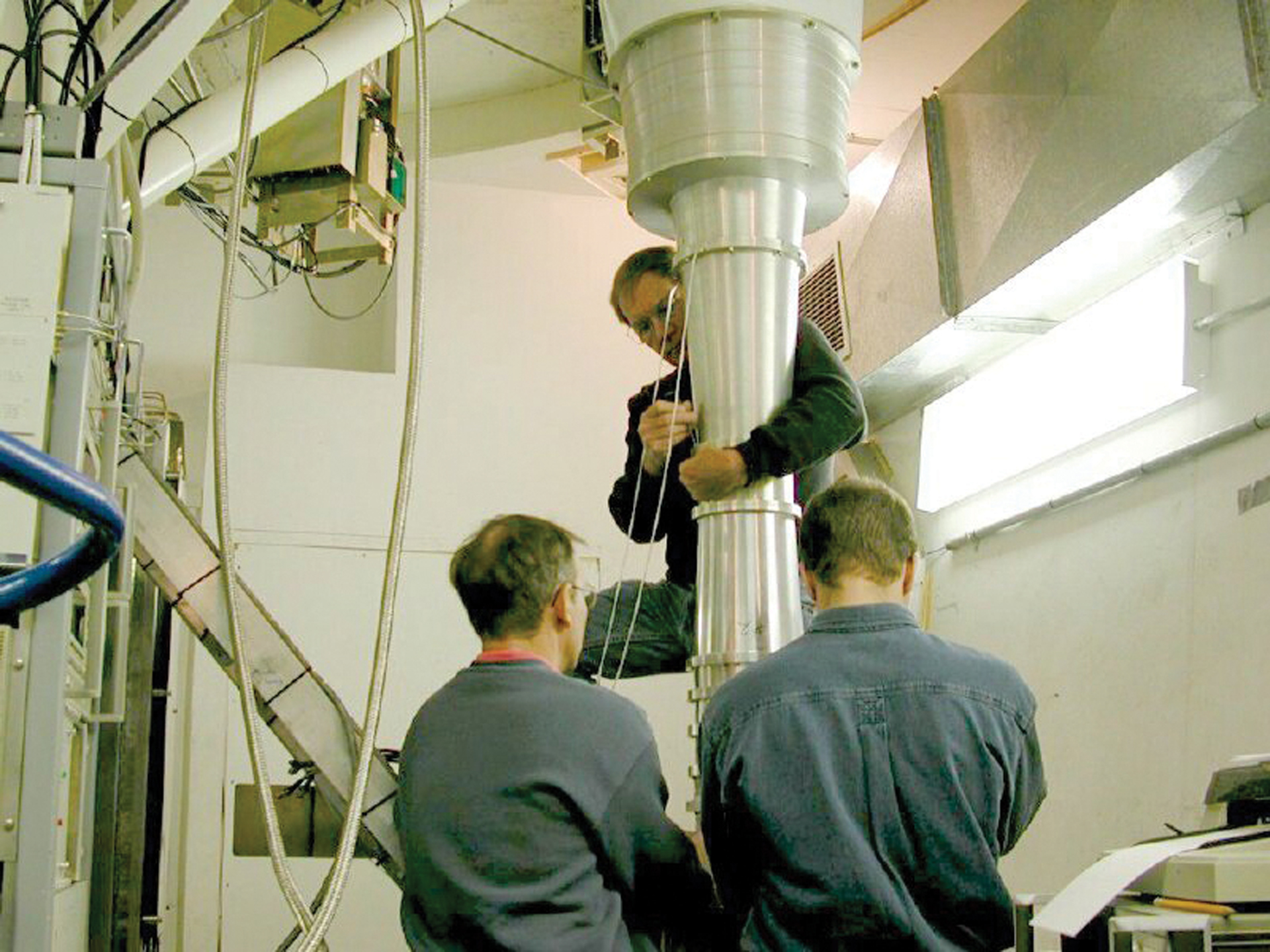 On a floating platform suspended from the 64-foot high feed arm on the Green Bank Telescope is the room that houses its eight receivers. In this photo, a large feed horn for a long wavelength receiver is being steadied so that a cryogenic pump can be attached. The supercooled receiver will collect the waves funneling down this horn and send them along fiber to the computers nearly two miles away in the noise-shielded control room. Top: Tom Dunbrack, left: Roger Norrod, right: Mike Stennes. (GBTreceiverroom_large.jpg)