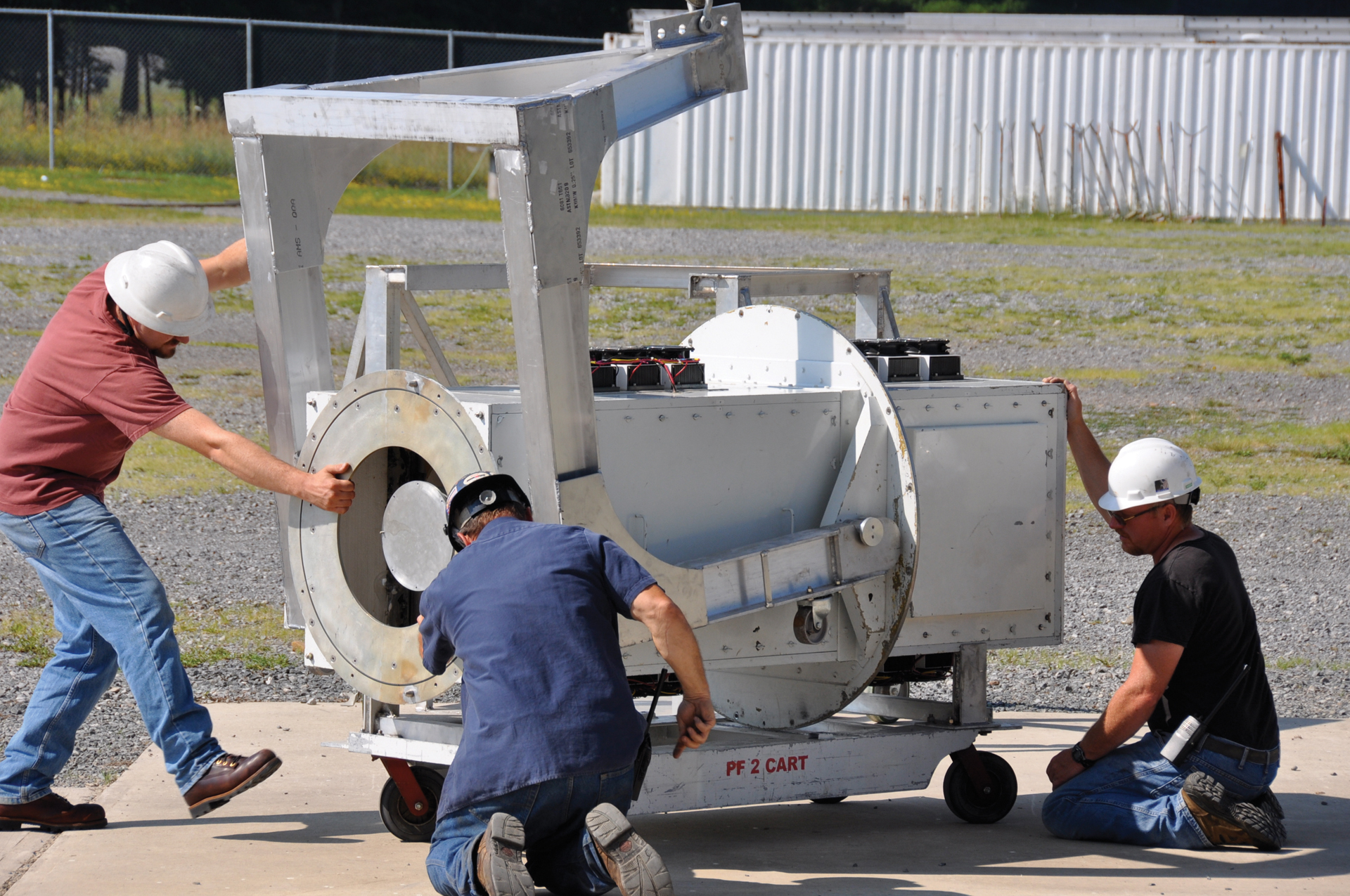 After a nearly 400-foot descent from the prime focus of the Green Bank Telescope (GBT), this large receiver arrives safely on the ground. Technicians will remove its cradle and get ready to wheel the unit into a truck for a 2-mile drive back to the electronics lab. Left to right: Jonah Bauserman, Shawn Nottingham, Edgar Friel. (GBTtechsFPAmove1_large.jpg)