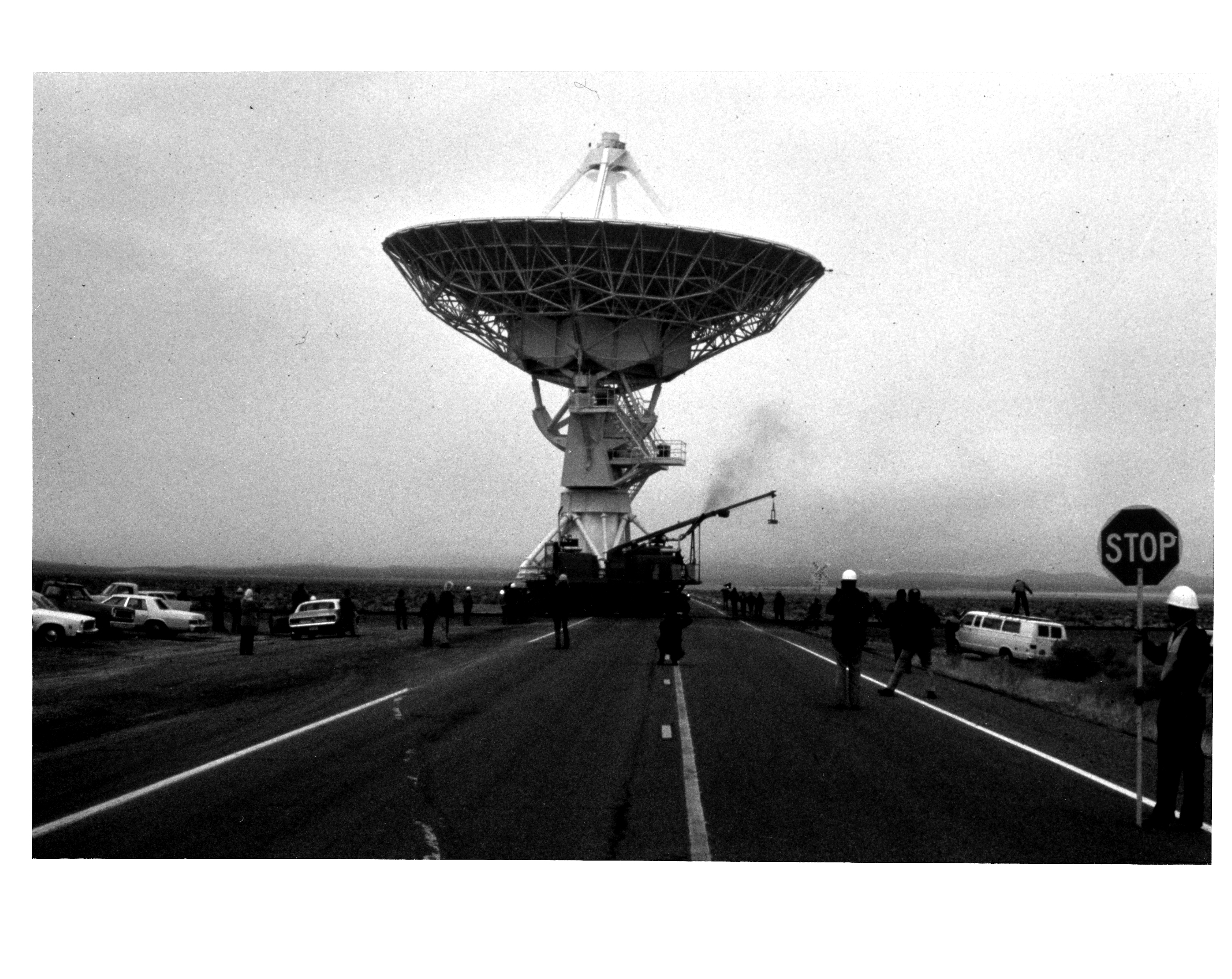 A VLA antenna crosses Rt. 66 during a configuration change. (Archive18412-bright.jpg)