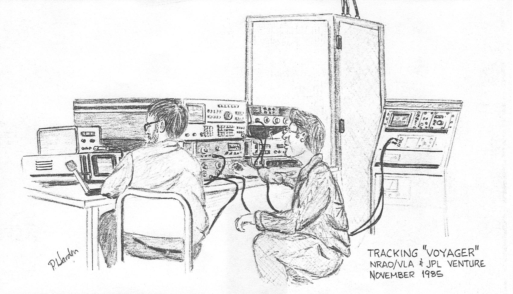 The VLA was used with Jet Propulsion Laboratory’s Deep Space Network in Goldstone CA to track NASA’s Voyager 2 encounter with Neptune in 1989. NRAO began planning and preparations in 1982, and test phased array observing on Voyager and planets began several years before the encounter as more antennas became outfitted for X-band. NRAO devoted 340 hours of VLA observing time to system tests and reception of Voyager's telemetry, and there were 40 scheduled telemetry passes from 26 April through 28 September 1989. This November 1985 sketch by Socorro's Paul Harden shows Bill Brundage (NRAO) and Ron Logan (JPL) with the test instrument setup at the VLA. (tracking-Voyager-Nov1985-Harding-sketch.jpg)