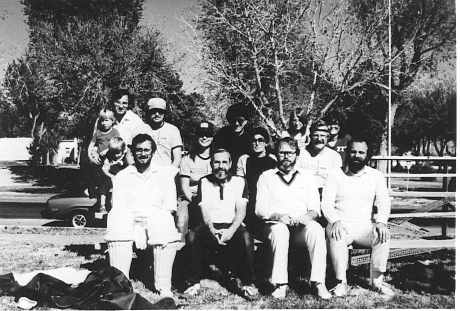 The winning cricket team, Socorro, November 1980. Front row: Peter Napier, Chris Salter, Dave Gibson, Gareth Hunt [captain]. Back row: Carl Bignell (holding Celeste and John Bignell), Bill Randolph, Rosalie Ewald, Tim Cornwell, Eva Jean Rigby, Brook Ekers, Eric Russell, Clair Rigby. The VLA team (pictured) beat the Socorro team. Players represented the USA, Jamaica, India, England, Holland, New Zealand, and Canada. Writing in the January 1981 Observer (v.22#1), Chris Salter said, "Passers by could be forgiven for imagining that mystical rites were being performed on the playing fields of New Mexico Institute of Mining and Technology on Saturday November 8th [1980]. The fact of the matter is that the slow perambulations and weird cavortings of fourteen white clad figures did not mark a frightening outbreak of alien worship but the progress of the first Socorro/VLA cricket match." (cricket-Socorro-8nov1980.jpg)