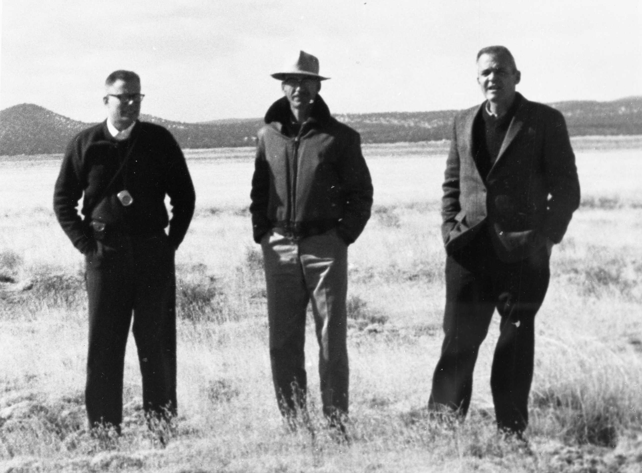 The search for a site for the VLA began in the mid-1960s with visits by members of the VLA Project team to a number of potential locations in the southwestern U.S. This photo was taken in February 1966 on the Plains of St. Augustin, in the general area of the future intersection of the array arms. On the left is Cam Wade, and on the right is Max Small, both from NRAO. In the center is Robert Weber, a geologist with the NM Bureau of Mines in Socorro, who was very knowledgeable about the geology of the Plains of San Augustin, and was hugely helpful to the VLA project. Around his neck, Wade has the Finnish forester's compass that he used to check out all the potential VLA sites, and to do the initial layout for the array. Caption information was provided by Cam Wade, who says the photo was probably taken by George Swenson using Max Small's camera. (GB66-02826_vla-site-search-feb1966.jpg)