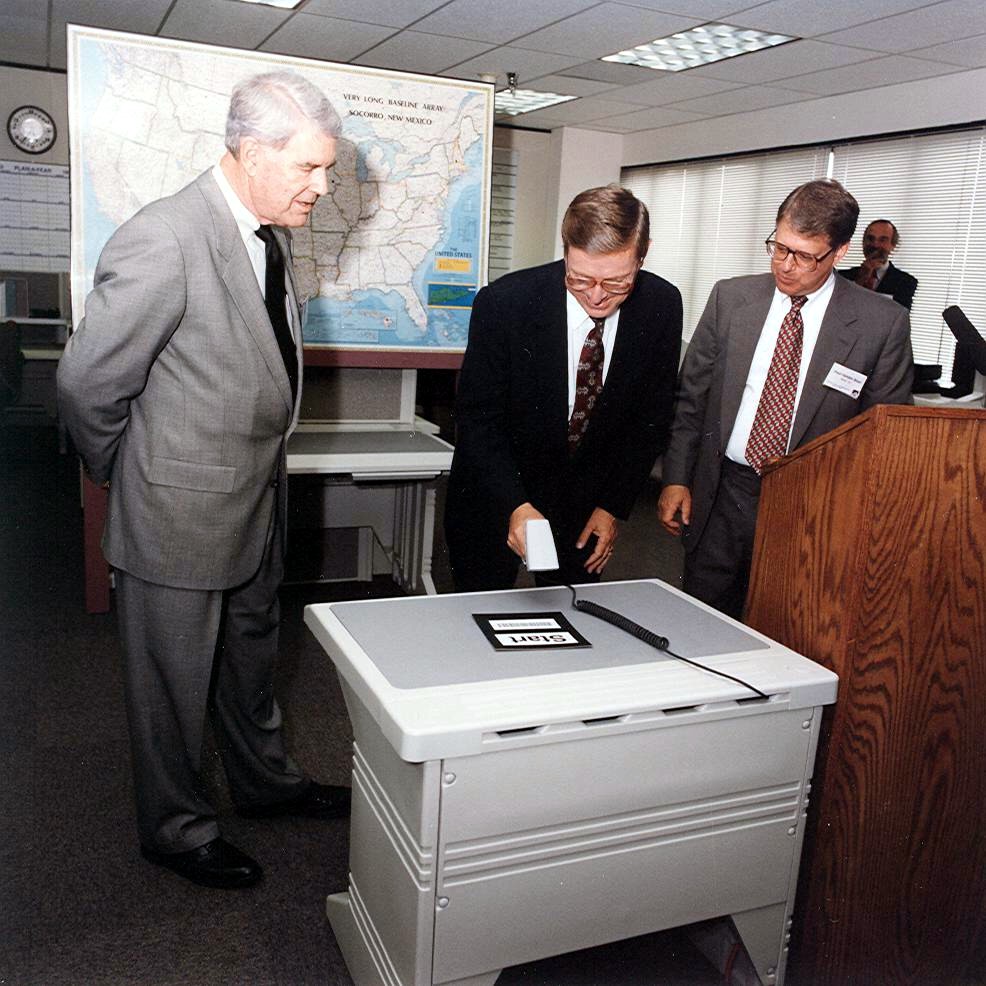 The VLBA was dedicated on 20 August 1993. In this photo, U.S. Representative Joe Skeen (left), NRAO Director Paul Vanden Bout (right), and NRAO Associate Director Bob Brown (background) watch as Senator Pete Domenici scans the bar code below the word "Start" to initiate observations of W3OH. As the antennas began to point, lights on the displayed map lit up for each station, sequencing from east to west. There also was a monitor that showed RA/Dec and Az/El for each antenna, and those numbers started changing as the antennas slewed toward their target. Bob Greschke, VLBA chief operator at the time, wrote the software for the bar-code trick that triggered the map-light sequence and then put a message on his operator's screen so he could manually start the actual pointing sequence. Thanks to Dave Finley and Bob Greschke for caption information, to Peggy Perley, Jon Romney, and Craig Walker for suggestions on finding out about the observing target, and to Jim Ogle, who searched through the (still readable!) years old Exabyte backup tape to find the source observed for the occasion. vlba_dedication_bar-code-scan.jpg